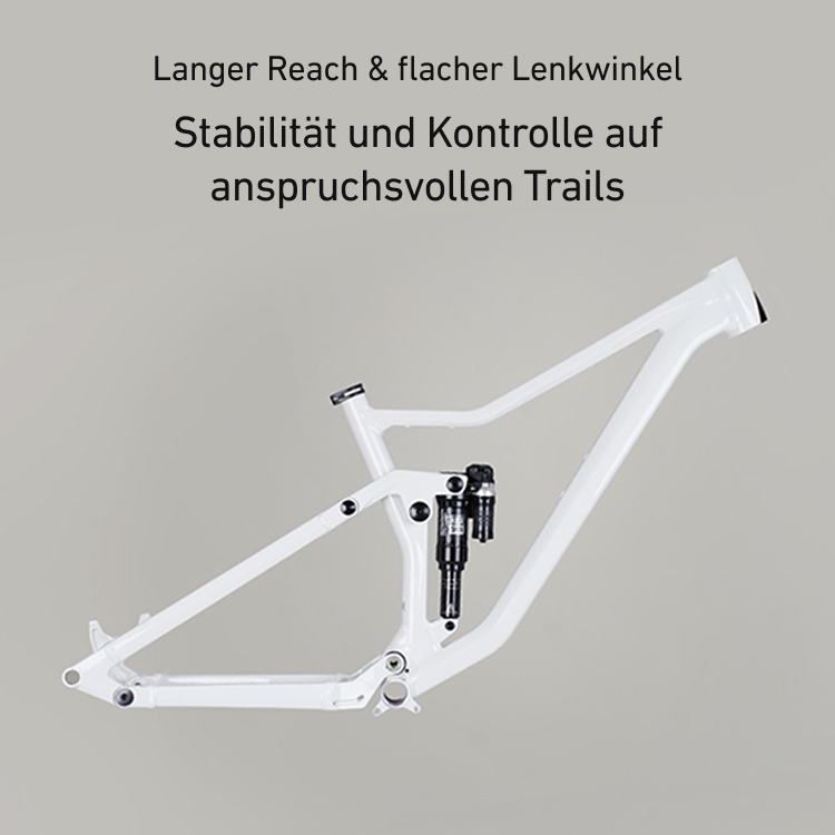 160 mm Federweg an der Front und 150 mm am Heck in Kombi mit einer modernen Trailbike Geo. So bist du ready für alles was die Trails dir entgegenwerfen.